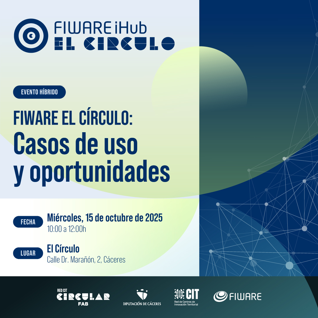 Únete a nosotros en el lanzamiento de EL CÍRCULO, el nuevo FIWARE Incubator Hub, un espacio diseñado para impulsar la innovación abierta y el desarrollo de soluciones inteligentes. En este evento se realizará la presentación del Fiware EL CÍRCULO, así como sus objetivos y servicios disponibles. Posteriormente tendrá lugar una ponencia donde podrás conocer qué es FIWARE, sus principales capacidades y casos de uso reales que ya están transformando sectores como las ciudades inteligentes, la energía, la movilidad y más. Una oportunidad única para descubrir cómo esta plataforma puede convertirse en motor de tus proyectos y conectar con una comunidad comprometida con el futuro digital. Agenda: 10:00 – 10:15h · Bienvenida. Representante de Diputación Cáceres y Telefónica. 10:15 – 10:35h · Presentación FIWARE EL CÍRCULO. Objetivos y servicios. Alexis Bote, Técnico en Innovación de El Círculo. 10:35 – 10:50h · Entrega del certificado de FIWARE Incubator Hub. 10:50 – 11:40h · Innovación Abierta con FIWARE: Ecosistema, Plataforma y Oportunidades. Juan Marcelo Gaitán Leiva, Director de FIWARE iHubs (Telefónica). 11:45 – 12:00h · Ruegos y preguntas.