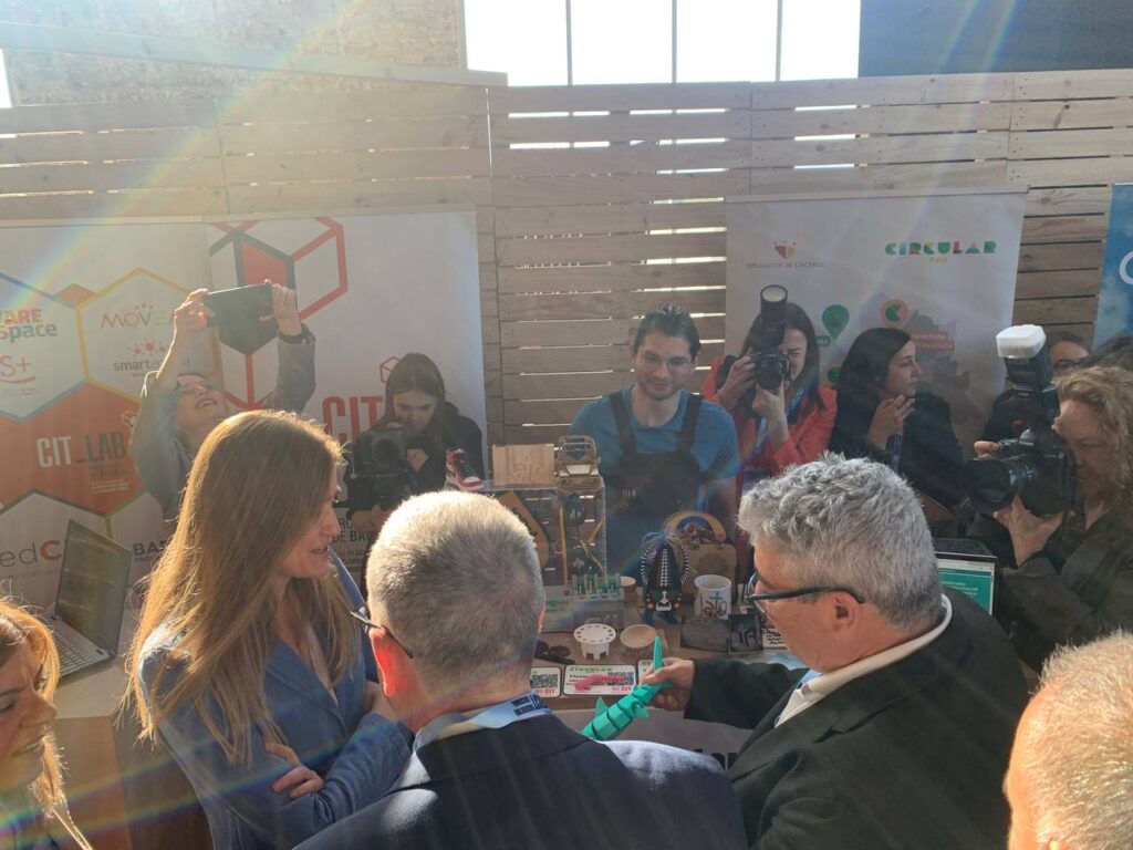 Uno de los momentos más destacados fue la visita al estand de la Red Circular FAB por parte de la Vicepresidenta Tercera del Gobierno y Ministra para la Transición Ecológica y el Reto Demográfico, Sara Aagesen Muñoz, acompañada por el Secretario General para el Reto Demográfico, Francesc Xavier Boya Alós, así como representantes de distintas administraciones regionales y locales. Durante su visita, el diputado delegado del área de Innovación de la Diputación de Cáceres, Tomás Sánchez Campo y el jefe de área Austín Aretio Gómez, presentaron las iniciativas que están llevando a cabo para fomentar la innovación, el talento local y la sostenibilidad en los territorios rurales de la provincia de Cáceres.