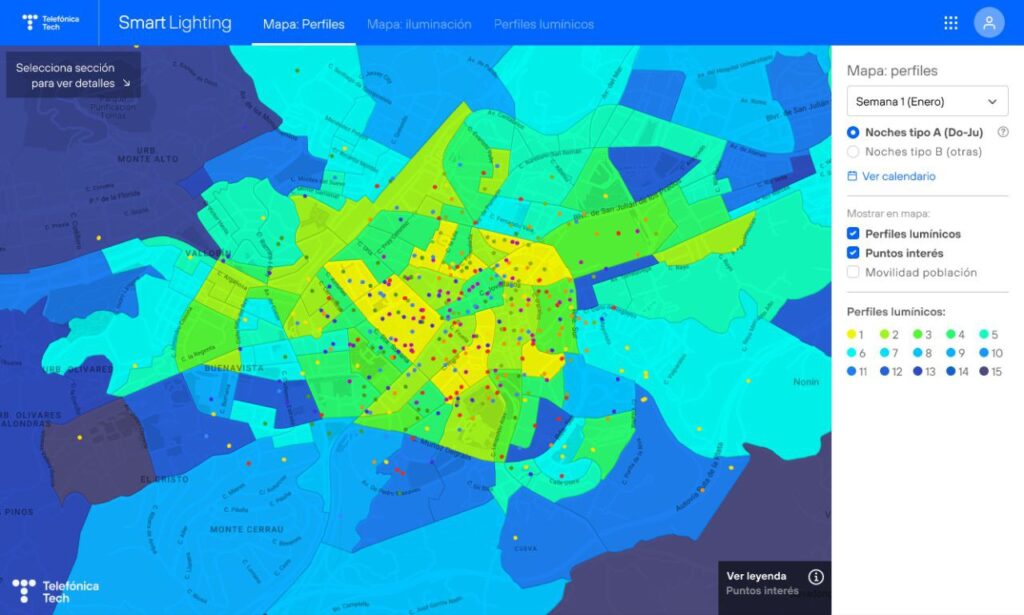 Gracias a este enfoque, en épocas como el verano se pueden reducir las horas o la intensidad de iluminación cuando no es necesaria, mientras que en zonas con mayor actividad nocturna, como áreas de ocio o turismo, se mantiene la luminosidad al máximo durante la madrugada. En cambio, en zonas con poco tránsito de personas o vehículos, la iluminación puede reducirse hasta un 50 % o incluso más sin comprometer la seguridad. Para ello, se han definido distintos perfiles lumínicos —hasta quince— que se aplican según el tipo de espacio, el horario y el uso del entorno. En los mapas de gestión, estos perfiles se representan mediante colores, mientras que los puntos señalizados corresponden a puntos de interés o luminarias concretas, facilitando una visión global e intuitiva del sistema.